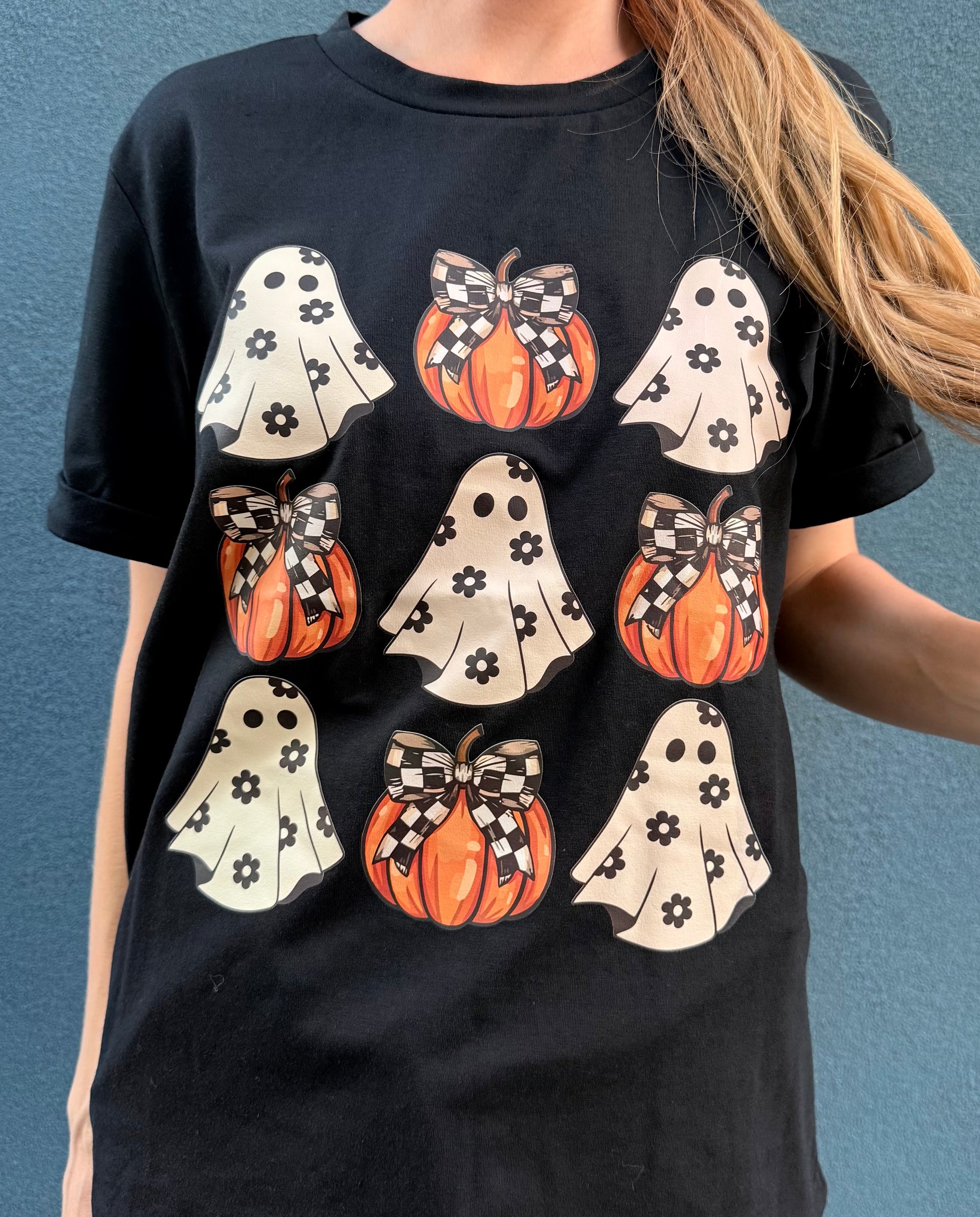 Ghosts & Pumpkins Graphic Tee – Spooky season made cute! This black tee features a playful grid of flower-print ghosts and checkered-bow pumpkins. Soft, comfy, and perfect for fall vibes, pumpkin patch trips, or Halloween festivities. 🎃👻🖤