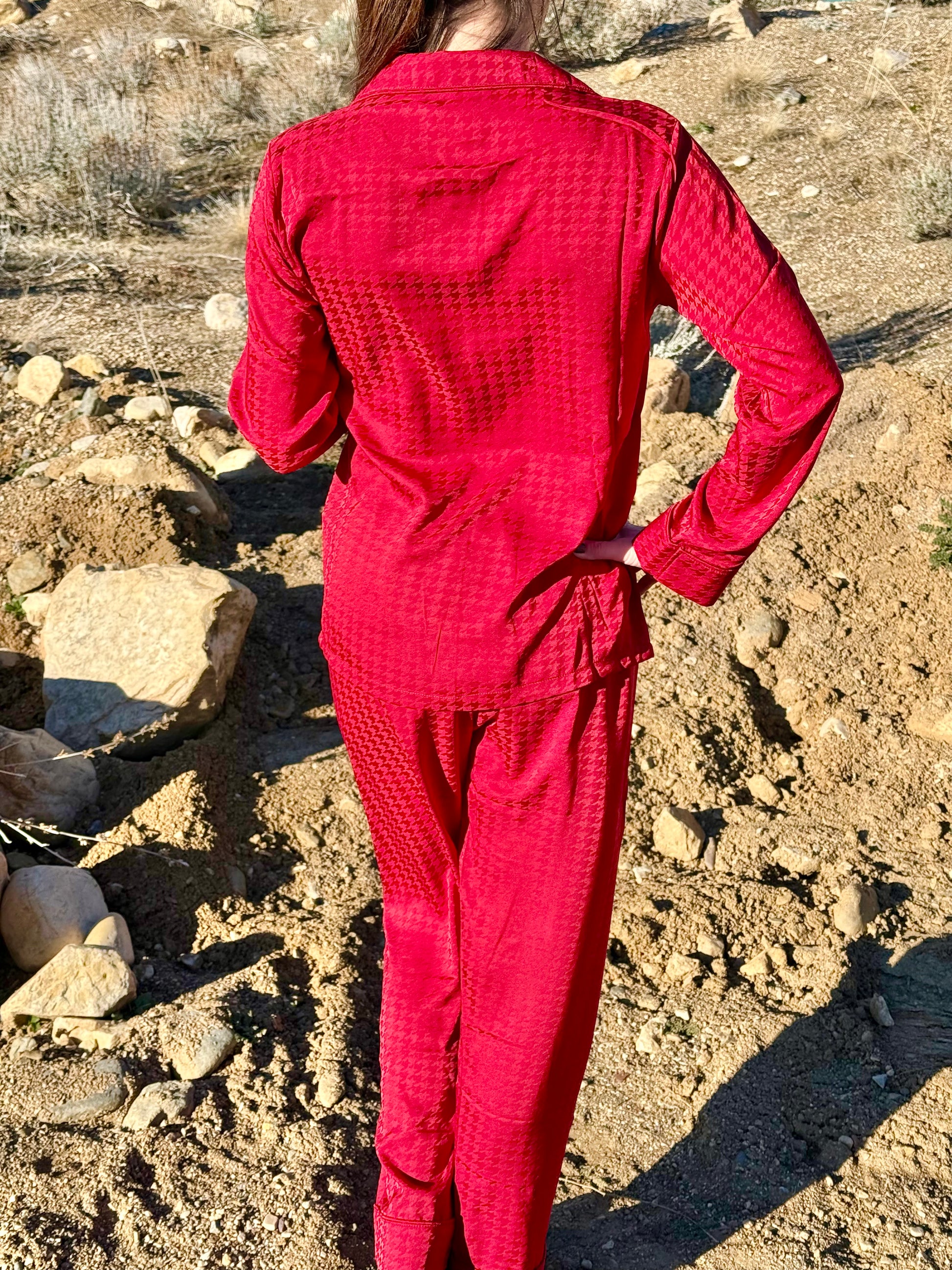 Slip into luxury with our Cozy Satin Night Pajamas. This rich red satin set features a silky-smooth feel with a subtle textured pattern, a classic button-up top, and relaxed-fit pants for ultimate nighttime comfort. Designed to feel as good as it looks, this set is perfect for cozy evenings, holiday lounging, or gifting someone special.