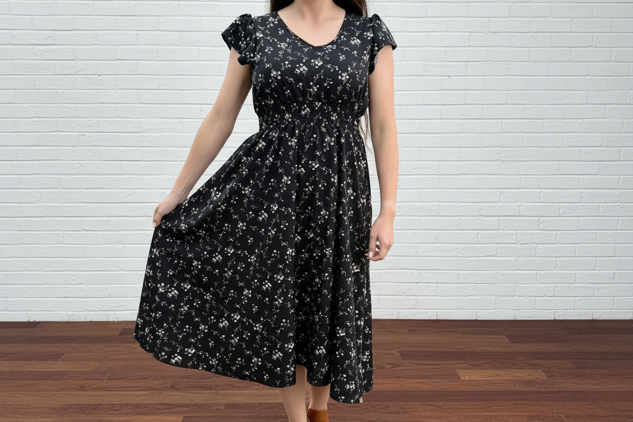 Fall in love with every detail of the Midnight Love Dress. Featuring a deep black base adorned with delicate floral blooms, this romantic midi dress is designed to flatter with its smocked waist and flowy silhouette. Flutter sleeves and a feminine neckline add the perfect touch of charm, making it ideal for Valentine’s dates, weddings, or everyday elegance. Effortless, comfortable, and endlessly versatile—this dress is one you’ll reach for again and again.