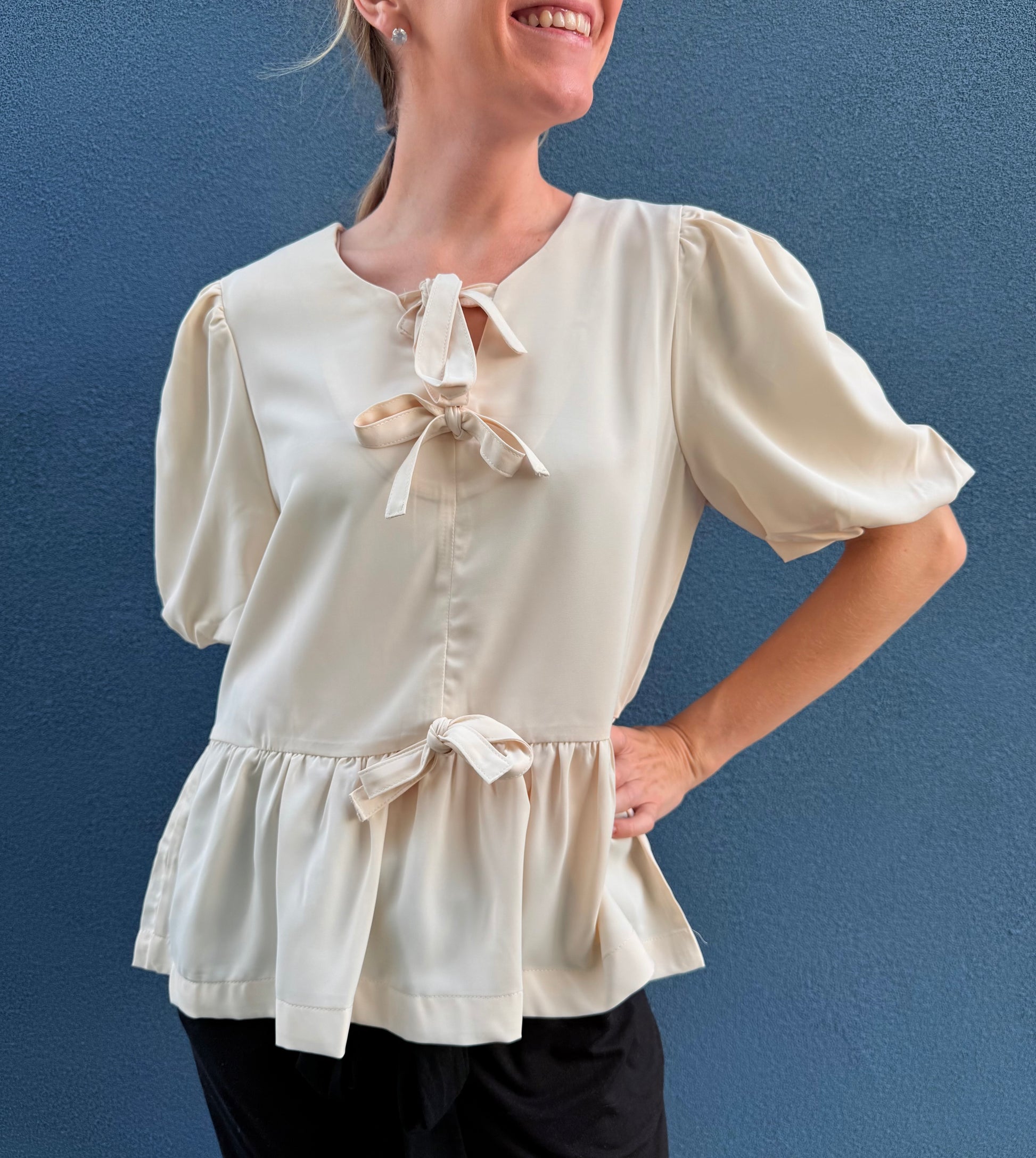 Bow Detail Peplum Blouse – Feminine and chic, this cream blouse features three sweet bow ties down the front, puff sleeves, and a flattering peplum hem. Lightweight and flowy, it’s perfect for pairing with jeans for a casual day out or dressing up with trousers for a polished look.